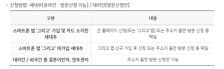 - 군 홈페이지 신청(또는 ‘그리고’ 앱) 주소지 읍면 방문 신청 중 택일